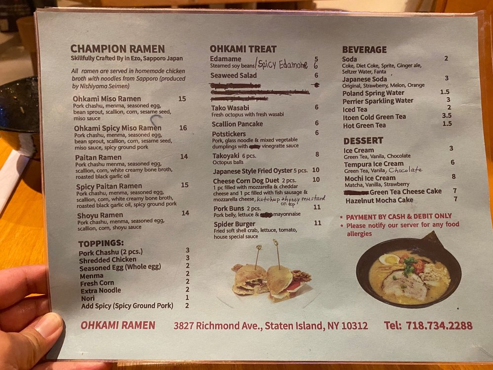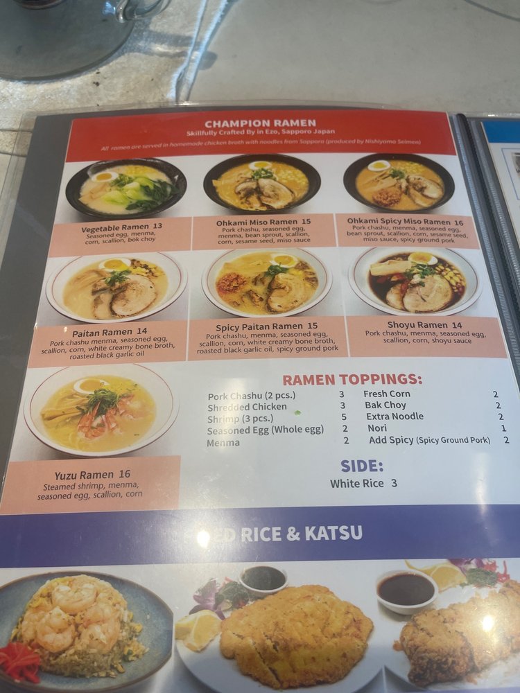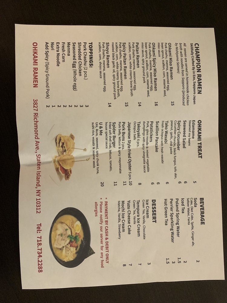 Introducing Ohkami Ramen, a cozy spot on Staten Island offering delectable Japanese comfort food. The menu is filled with enticing options like the Champion Ramen, featuring a NEW Spicy Beef Rib Ramen with flavorful toppings. Customers rave about the tender Chashu Pork and savory broths like the Spicy Pork Miso. The Chicken Katsu and Beef Katsu entrees are also popular choices. The friendly staff and quick service add to the inviting atmosphere, making it a great spot for a satisfying meal. Don't miss out on trying their signature Shrimp Spring Rolls and Scallion Pancakes for a delightful start to your dining experience. Overall, Ohkami Ramen impresses with its flavorful dishes and warm ambiance, making it a must-visit for ramen enthusiasts and food lovers alike.